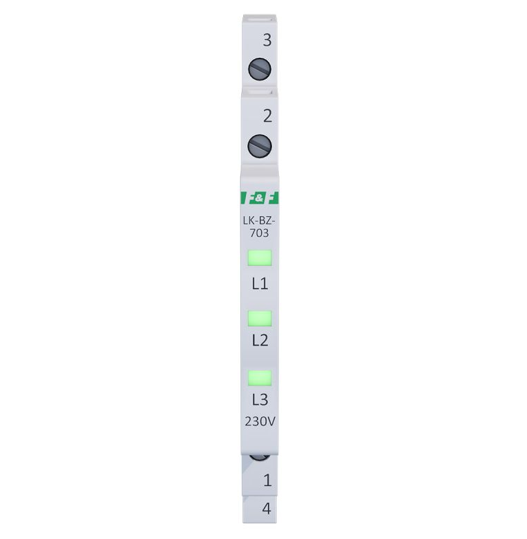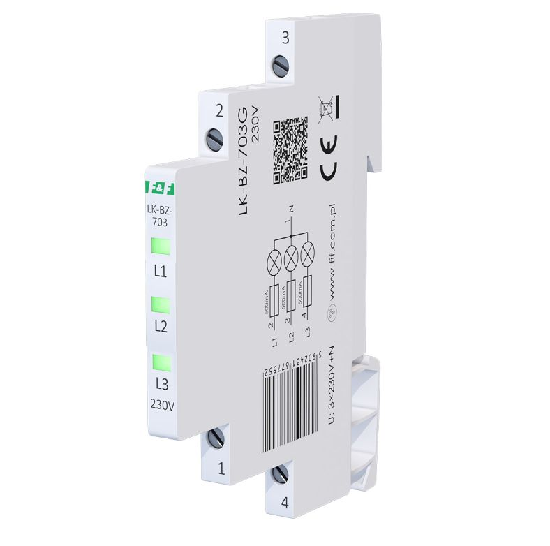 Lampka kontrolna LK-BZ-703G to nowoczesne i kompaktowe rozwiązanie przeznaczone do sygnalizacji obecności napięcia w poszczególnych fazach sieci 3-fazowej. Wyposażona w trzy zielone diody LED oraz wbudowane zabezpieczenia w postaci szybkich bezpieczników topikowych, zapewnia niezawodną i bezpieczną pracę bez konieczności stosowania dodatkowych modułów ochronnych.