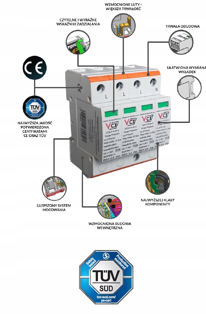 Modułowe ochronniki przepięć VCX-P-B+C klasy T1 T2 Dedykowane są do ochrony instalacji zasilających nN przed skutkami przepięć indukowanych i łączeniowych.