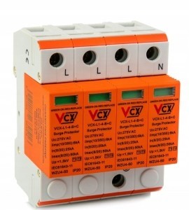 Modułowe ochronniki VCX-L1-B+C 6kA klasy T1T2 Dedykowane są do ochrony instalacji zasilających nN przed skutkami przepięć indukowanych i łączeniowych. Powinny być stosowane jako jednocześnie pierwszy i drugi stopień ochrony w tablicach piętrowych, podrozdzielniach. Ochronniki zamontowane winny być się w miejscach wprowadzeń instalacji elektrycznej do budynku. Zapewniają kompletną ochronę instalacji elektrycznej oraz zasilanych z niej urządzeń elektrycznych przed działaniem części prądu piorunowego oraz innego rodzaju przepięciami. Redukują przepięcia i sprowadzają do ziemi prądy udarowe pochodzące od obu rodzajów przepięć – bezpośrednich oraz pośrednich. Zapewniają jednocześnie dwustopniowy poziom ochrony. Stosowanie modułowych ochronników przepięć VCX-L1-B+C 6kA klasy T1T2 nie wymaga używania dławików odsprzęgających. Zapewniają skuteczną ochronę komputerów, urządzeń RTV/AGD i itp. Wyposażone są w wizualny wskaźnik działania (zielony – ochrona, czerwony – brak ochrony).