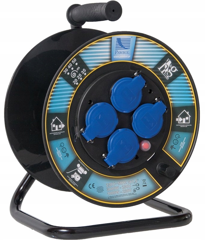 Przedłużacz bębnowy PB OWY 3x1 5-30m B.1115-250GZI-30 PAWBOL- idealnie sprawdzi się na budowie, podczas pracy w ogrodzie lub przy remoncie mieszkania, a dzięki ergonomicznemu uchwytowi z łatwością przeniesiemy go w dowolne miejsce. Wykonany został z wysokiej jakości materiałów oraz posiada stopień IP 44, zapewnia on ochronę przed ciałami o wielkości ponad 1 mm oraz kroplami wody. Przedłużacz wyposażony jest w 4 gniazda GZ 16A, a długość przewodu wynosi 30m. Dodatkowo przedłużacz posiada wyłącznik termiczny, który zabezpiecza przed przegrzaniem gniazd.