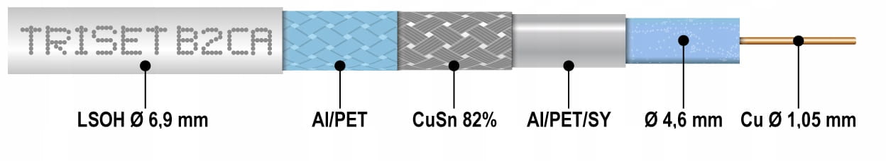 Wysokiej jakości przewód koncentryczny TRISET B2CA E1020_500 dedykowany do budowy instalacji RTV/SAT w budynkach instytucji publicznych. Kabel wykonany w płaszczu LSZH (LS0H) - izolacja bezhalogenowa, stosowany tam, gdzie potrzebne jest większe bezpieczeństwo na wypadek pożaru (szkoły, szpitale). W przypadku pożaru kable te nie rozprzestrzeniają płomienia, emisja dymu jest bardzo niska, a emitowane gazy nie są korozyjne.