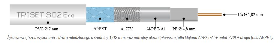Wysokiej jakości przewód koncentryczny Tri-Shield TRISET 302 Eca E1005 przeznaczony zarówno do instalacji indywidualnych, jak i zbiorczych. Z powodzeniem może być stosowany w instalacjach naziemnej telewizji cyfrowej DVB-T2, radia FM/DAB oraz systemach multiswitchowych (telewizja naziemna DVB-T2 oraz satelitarna DVB-S/S2). Wysokiej jakości, potrójnie ekranowany kabel koncentryczny typu RG6 posiada żyłę wewnętrzną wykonaną z drutu miedzianego o średnicy 1,02 mm, co sprawia, że kabel posiada bardzo dobre parametry tłumiennościowe. Rdzeń ten nie ulega korozji, a przewód nie jest sztywny. Przewód koncentryczny TRISET 302 Eca E1005 posiada 77% pokrycie oplotem gwarantujące wysoki poziom ekranowania i chroniące sygnał użyteczny przed wpływem zakłóceń zewnętrznych.