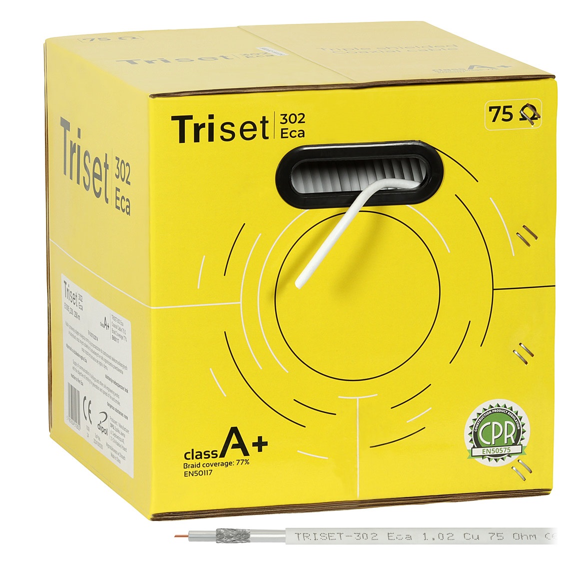 Wysokiej jakości przewód koncentryczny Tri-Shield TRISET 302 Eca E1005 przeznaczony zarówno do instalacji indywidualnych, jak i zbiorczych. Z powodzeniem może być stosowany w instalacjach naziemnej telewizji cyfrowej DVB-T2, radia FM/DAB oraz systemach multiswitchowych (telewizja naziemna DVB-T2 oraz satelitarna DVB-S/S2). Wysokiej jakości, potrójnie ekranowany kabel koncentryczny typu RG6 posiada żyłę wewnętrzną wykonaną z drutu miedzianego o średnicy 1,02 mm, co sprawia, że kabel posiada bardzo dobre parametry tłumiennościowe. Rdzeń ten nie ulega korozji, a przewód nie jest sztywny. Przewód koncentryczny TRISET 302 Eca E1005 posiada 77% pokrycie oplotem gwarantujące wysoki poziom ekranowania i chroniące sygnał użyteczny przed wpływem zakłóceń zewnętrznych.