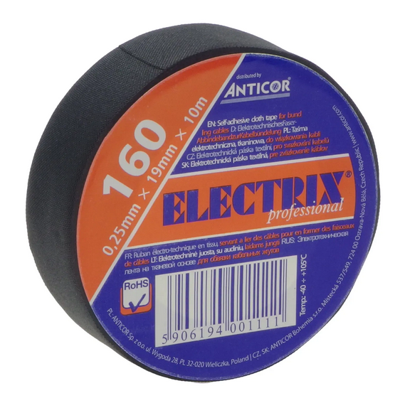 Anticor ELECTRIX 160 to wysokiej jakości taśma elektrotechniczna tkaninowa o wysokiej wytrzymałości na rozciąganie oraz zerwanie, przeznaczona do wiązania, organizacji i ochrony przewodów w instalacjach elektrycznych oraz motoryzacyjnych. Dzięki cienkiej strukturze (grubość zaledwie 0,25 mm) zapewnia maksymalną elastyczność, nie zwiększając przy tym średnicy wiązki przewodów.