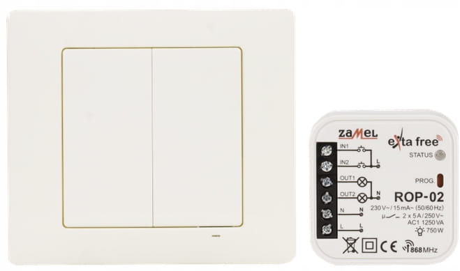 Radiowe odbiorniki dopuszkowe znajdują zastosowanie zarówno jako elementy do montażu w puszkach instalacyjnych pod- i natynkowych, jak i jako urządzenia wykonawcze zabudowywane bezpośrednio w obudowach opraw oświetleniowych i innych odbiorników. ROP-02 umożliwia pracę w 5 różnych trybach (załączenie, wyłączenie, tryb monostabilny, bistabilny, czasowy).